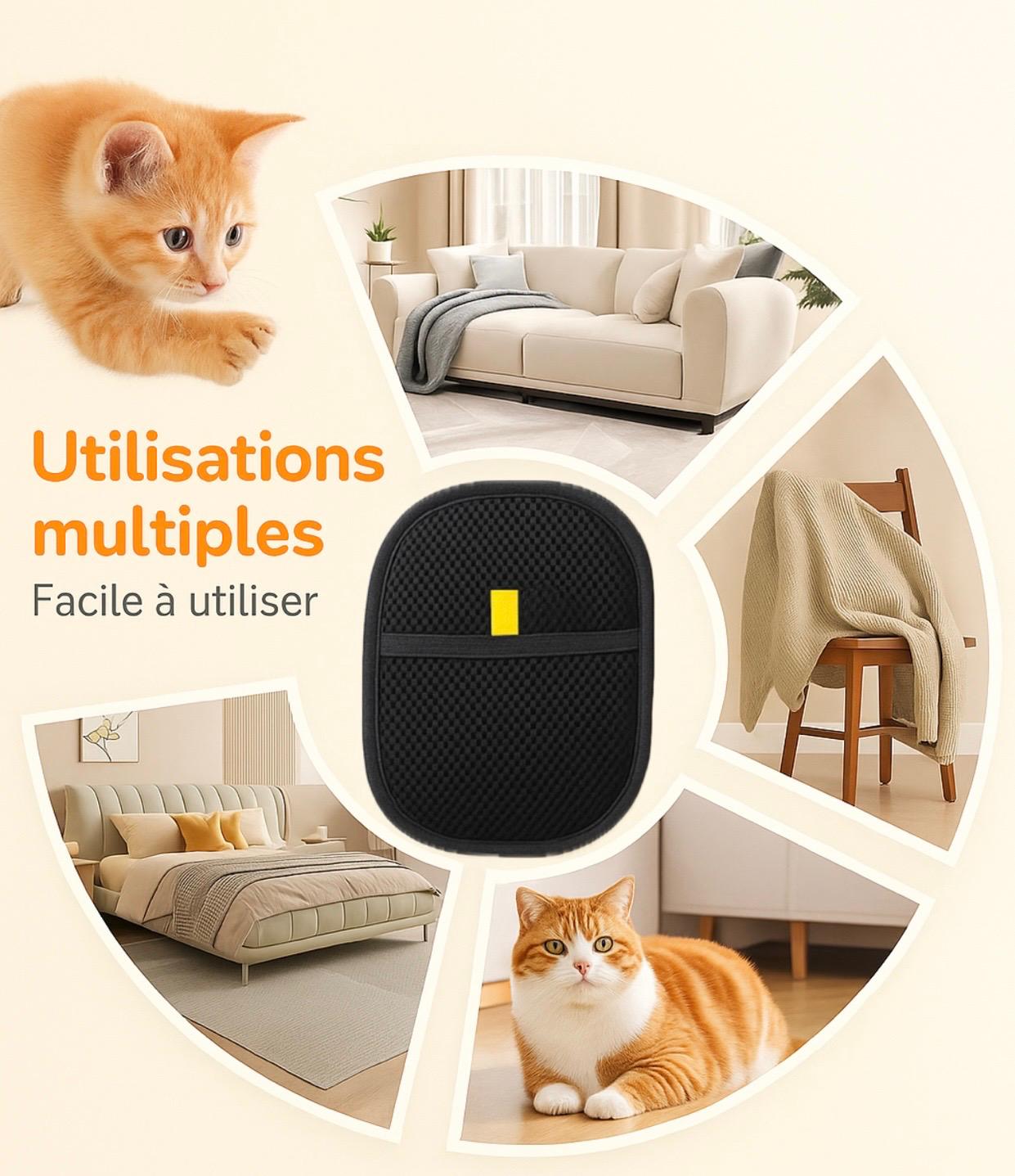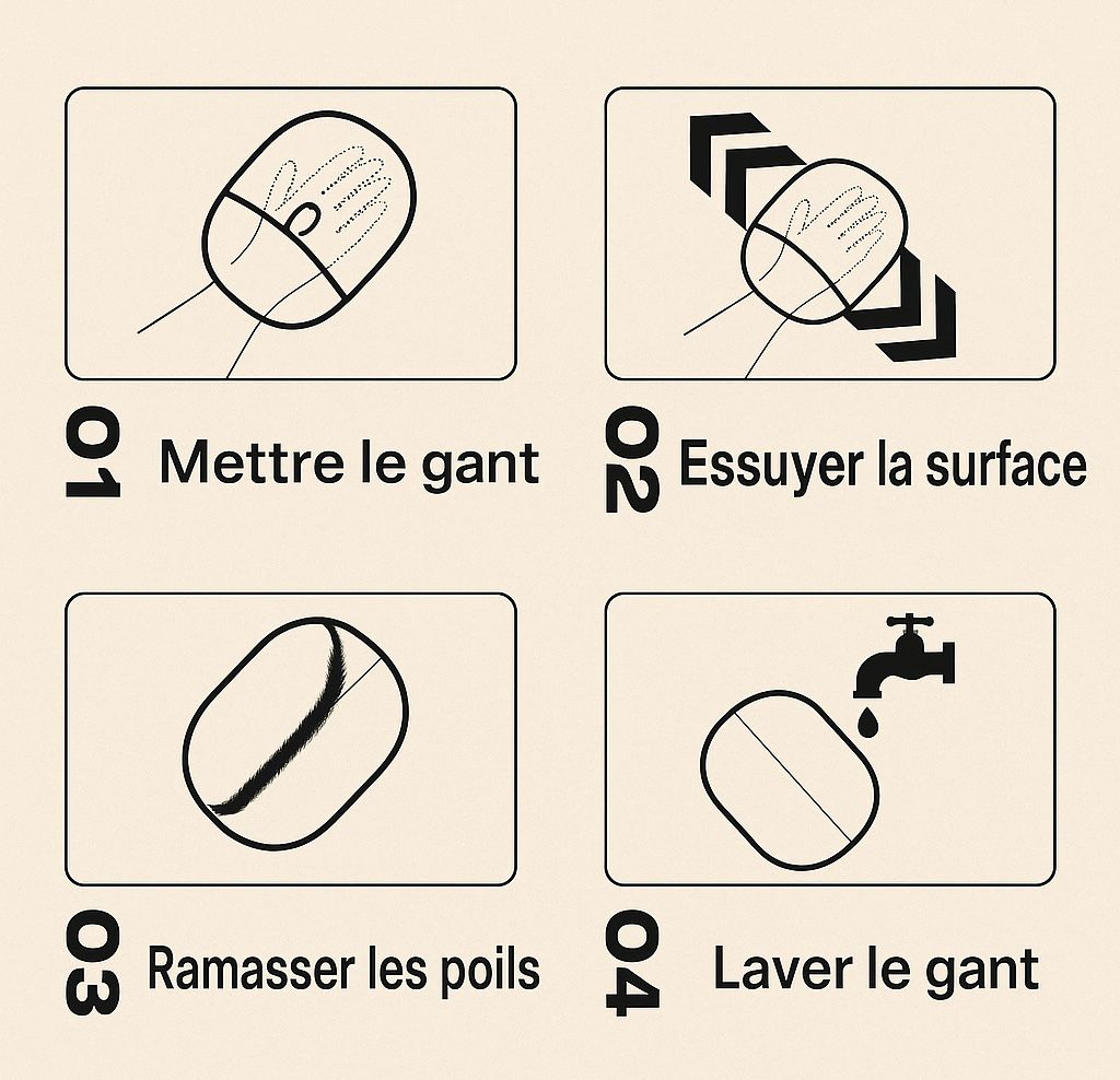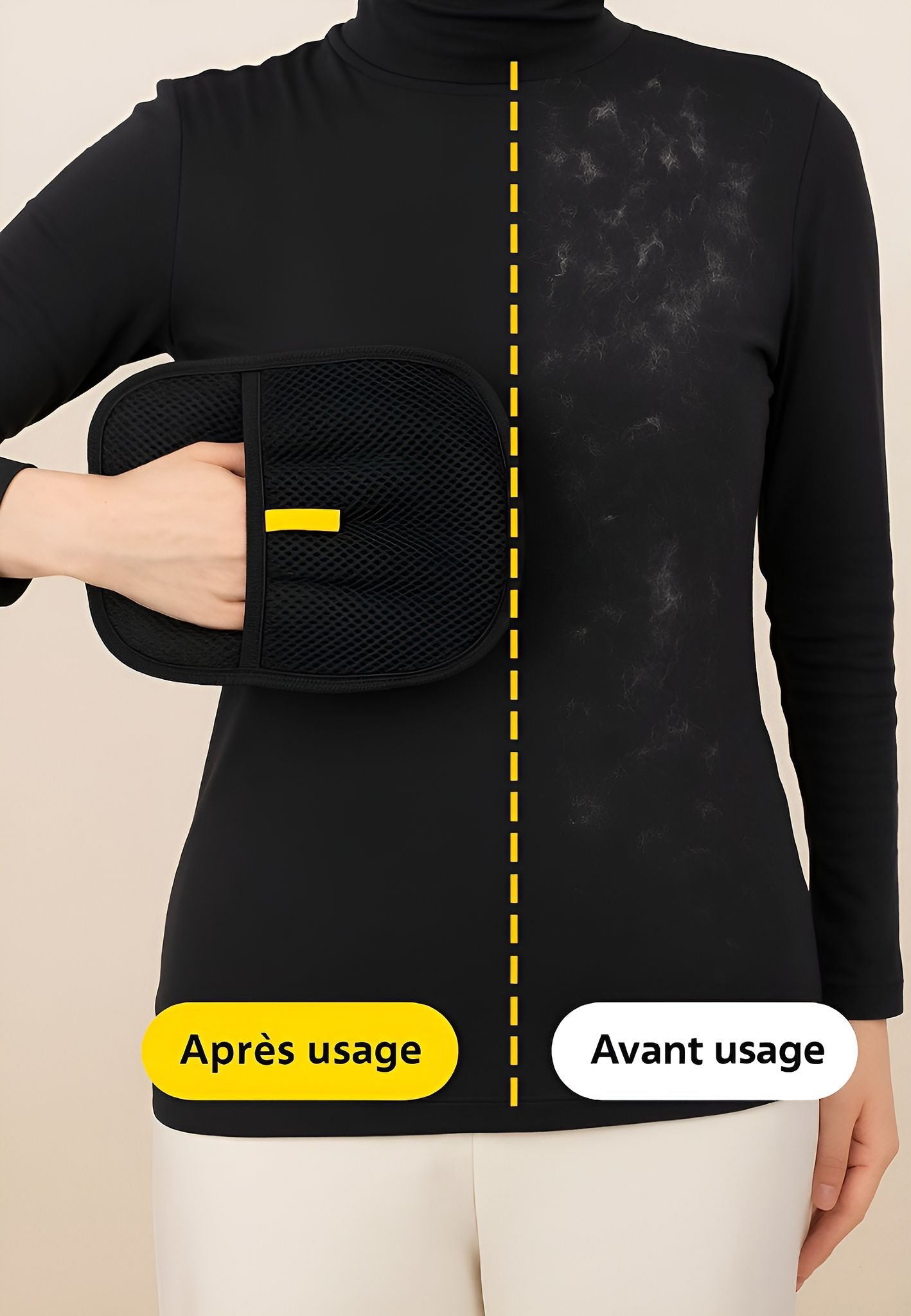 Les fibres spéciales du gant génèrent une légère charge électrostatique qui capte les poils en profondeur sur toutes les surfaces — tissus, canapés, vêtements, sièges de voiture, paniers d’animaux, etc.